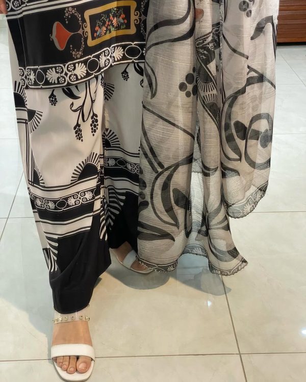3 Pcs Swiss Lawn Printed Dress – Black & White – Medium Size – Shirt, Trouser & Dupatta Set (stitched Suit)